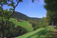 Hier beginnt der nächste Teil des Wiesensteigs. Von der Renchtalhütte aus führt der Weg über Breitenberg an Haus Kirchberg vorbei. Auf einem schmalen kurvigen Pfad gehts durch Wald und Wiesen ein Stück bergauf und dann bergab. Die Landschaft ist abwechslungsreich und bietet immer neue Ausblicke auf die andere Talseite.